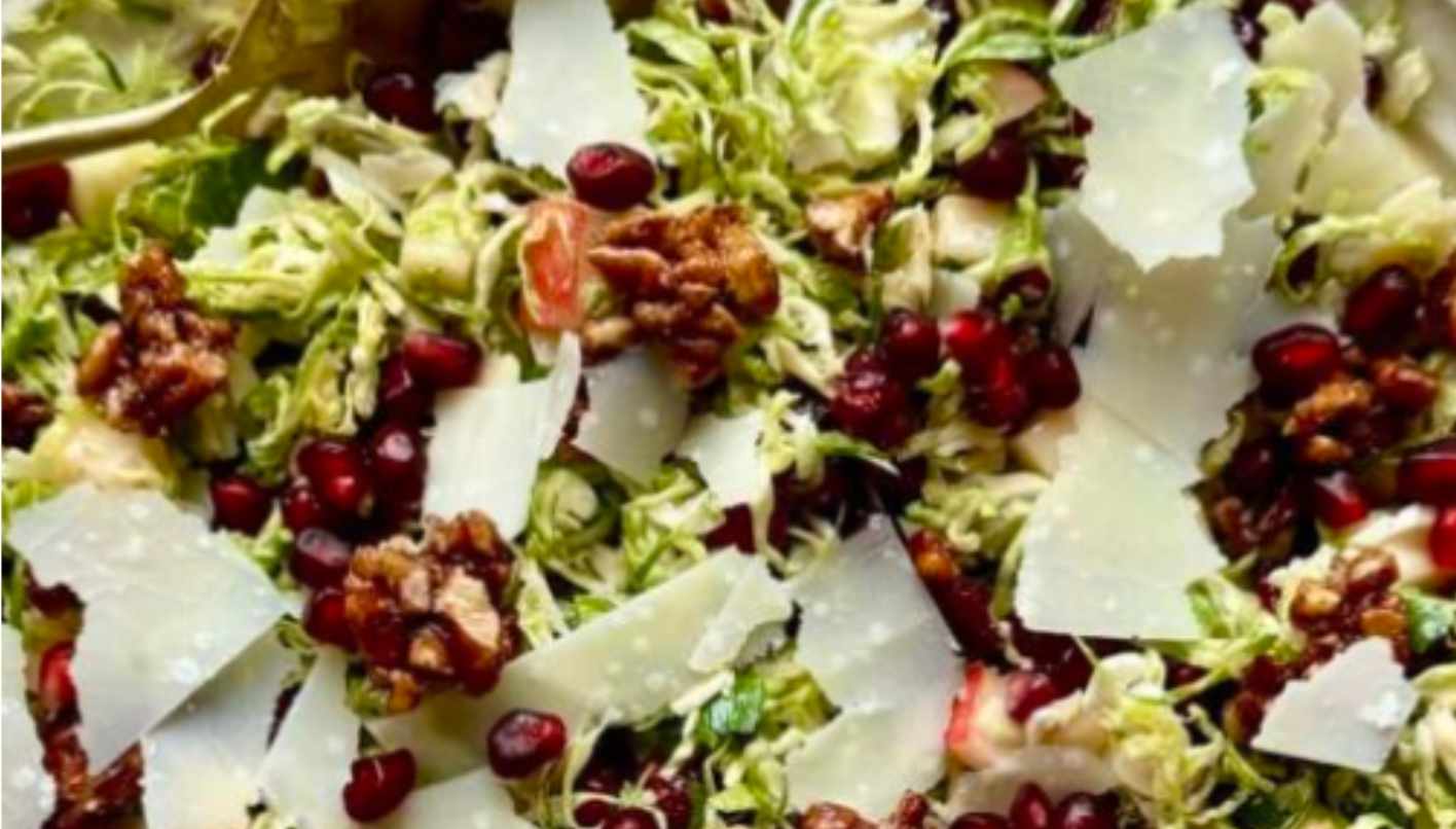 Let the salad sit for about 30 minutes before serving. As it sits, the acid in the dressing will soften up the sprouts. Serve with extra parmesan, dried fruit, and pecans.